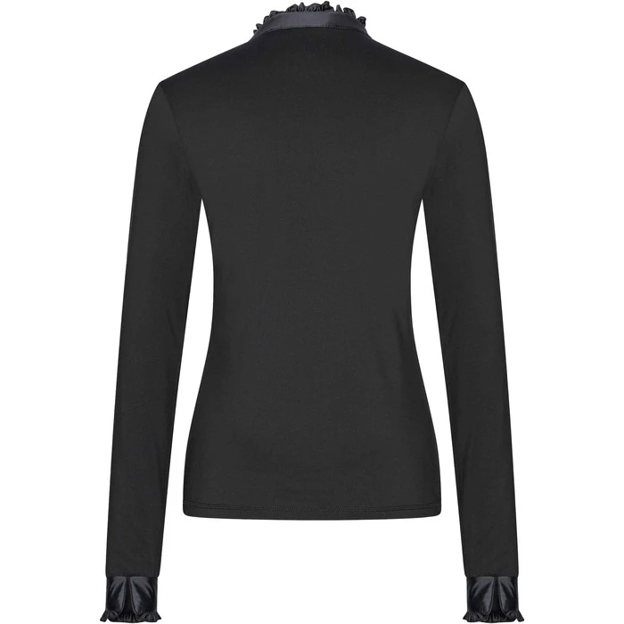 - Standing collar with ruffle detail