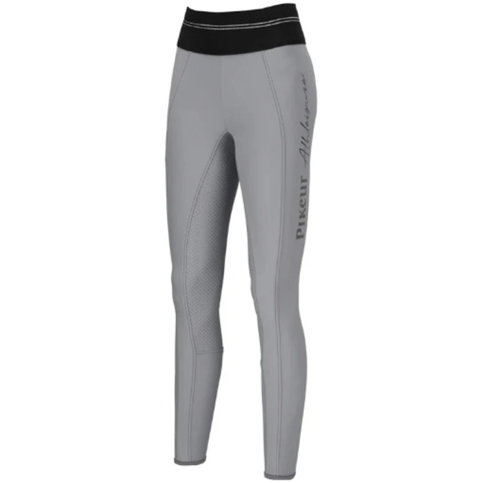 Pikeur Gia Grip Sporty Ladies Athleisure breeches with full grip seat panel and high rise waist. These breeches have a useful mobile phone pocket on the right thigh and Pikeur Athleisure glitter print at the left side. The Dark Green colour is new for 2021!