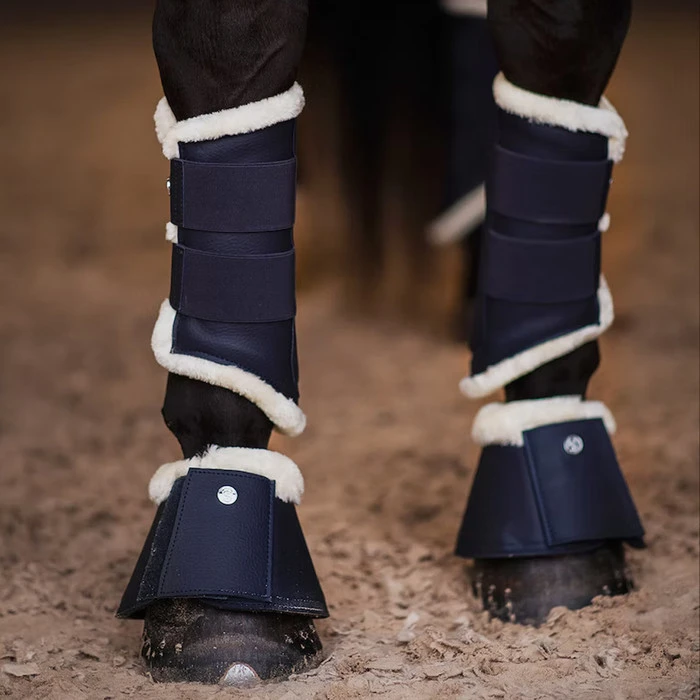 Padded bell boots with velcro fastening. Vegan leather surface and faux fur at top edge, and PS logo stud at front.