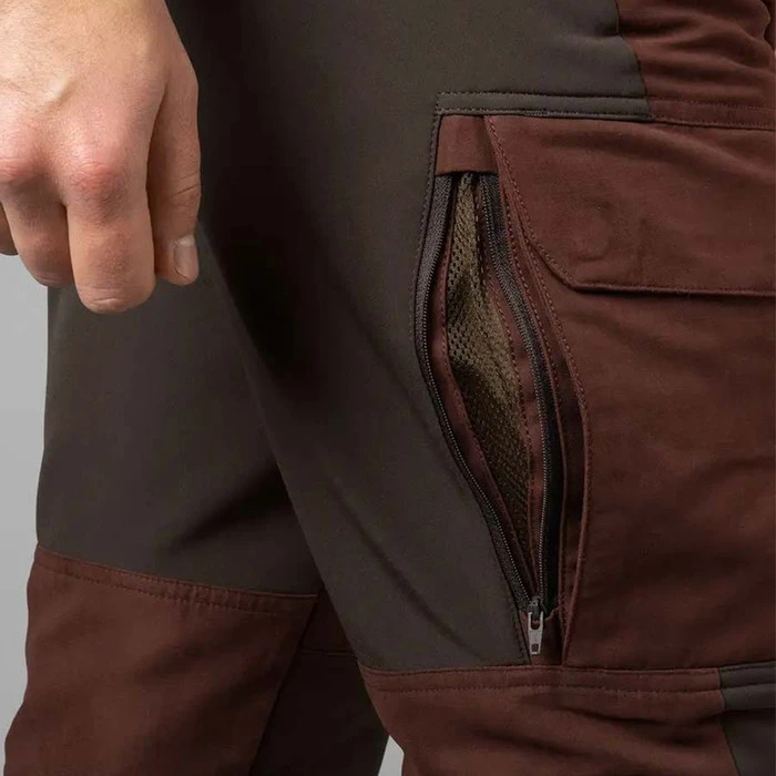 The Hรคrkila Scandinavian trousers are made from a very low-noise, soft, hardwearing and quick-drying cotton and polyester blend. They also have an active fit, with an elasticated waistband and stretch panels in the seat, knees and thighs. They are supremely comfortable for both walking and stalking. They also have a range of features that you will quickly find invaluable: long, mesh-backed, ventilation zips on the back of the thighs, to let air circulate in hot weather, while keeping insects and bits of vegetation out. On the front of the thighs are large, zipped pockets, with protective flaps featuring silent, magnetic closures. The right pocket contains a cartridge holder for four extra rifle cartridges, and within the left pocket is a small pocket to keep your mobile phone secure when you are on the move.
