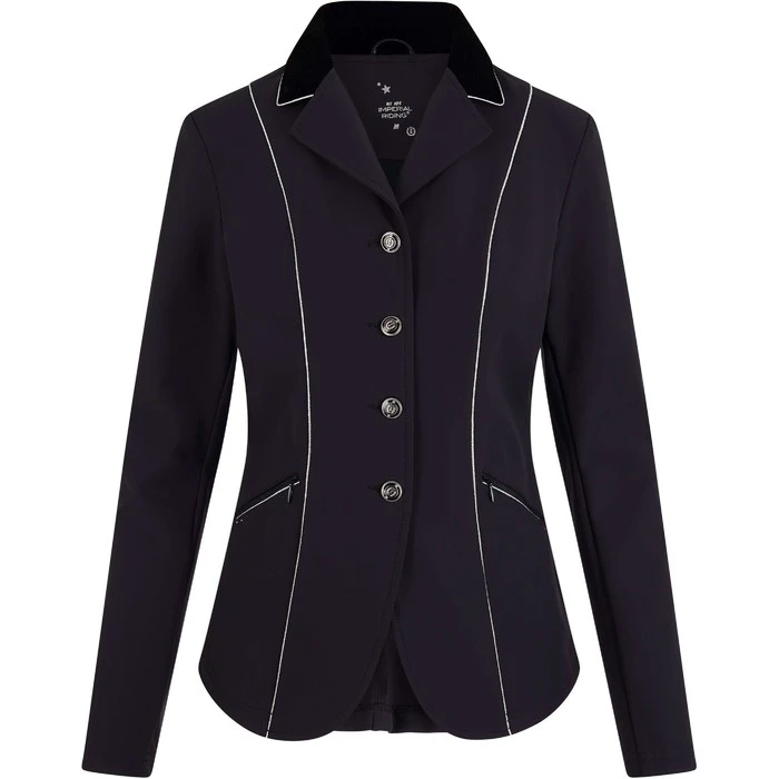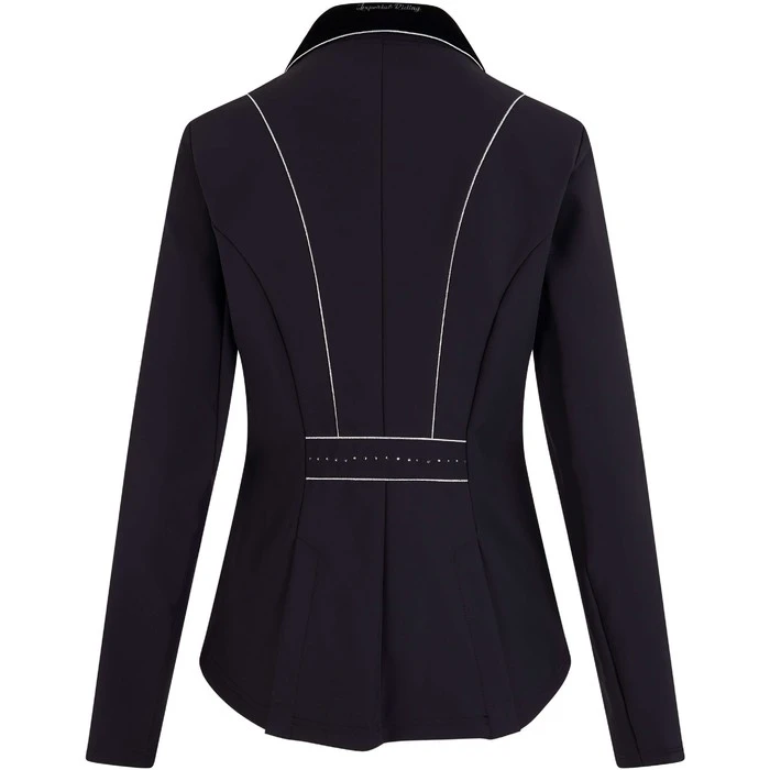 Chic tournament jacket with a beautiful fit and a glamorous touch. This stylish jacket with 4 shiny logo buttons features glittering, sparkling rhinestones on the zipped pockets at the front and on the rear straps in the back area. The shiny silver piping can be found all over this garment: on the front, on the zipped front pockets, along the edge of the collar, on the back, and along the rear strap. The collar is lined with fashionable velvet, and it features a shiny drawing on the back. This tailored jacket is lined with a net fabric that features a star pattern and has a high level of breathability. The front and the back are rounded and feature a double slot.