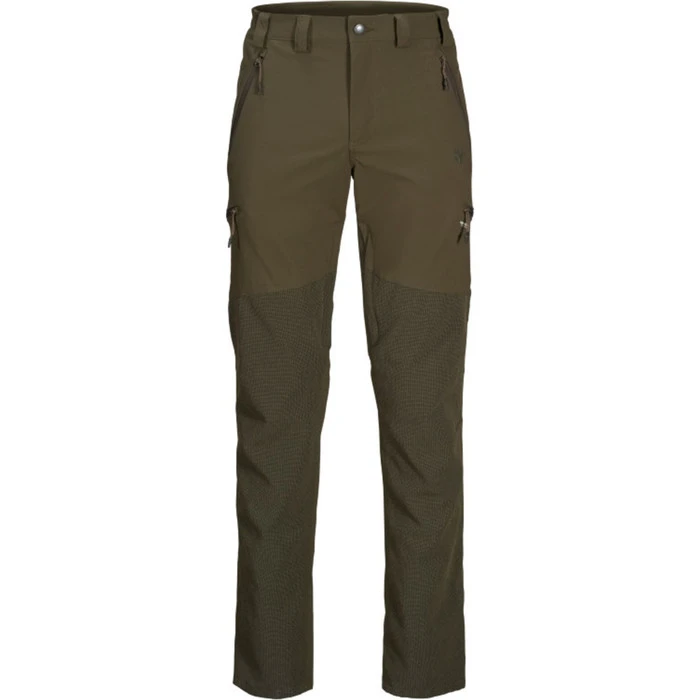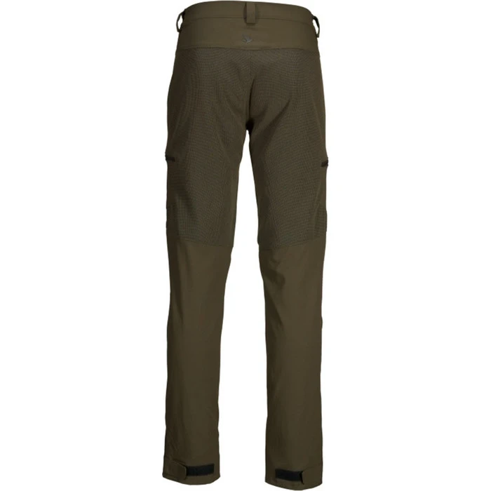 Our Outdoor Membrane trousers are highly recommended when durability is crucial, such as in dense vegetation on a driven hunt or working hard on maintaining your hunting grounds. The strategically placed reinforced panels on the lower leg, seat and knees show their worth during strenuous activity, providing great wear-resistance. The trousers are the most hardwearing in the Outdoor range and are also the only windproof and waterproof trousers with a SEETEXยฎ membrane. The trousers have four pockets: two on the thighs and two on the hips. When zipped up, a small piece of fabric covers the zip head, keeping it out of the way and preventing it from catching on anything. The stitching at the knees is designed to let you squat without overstretching the fabric. There are also belt loops at the waist. The trousers are extremely comfortable, with an elasticated waist and ankle adjustments, for a perfect fit. The Outdoor Membrane trousers are ideal for varied, demanding outdoor use, when you need both comfort and protection.