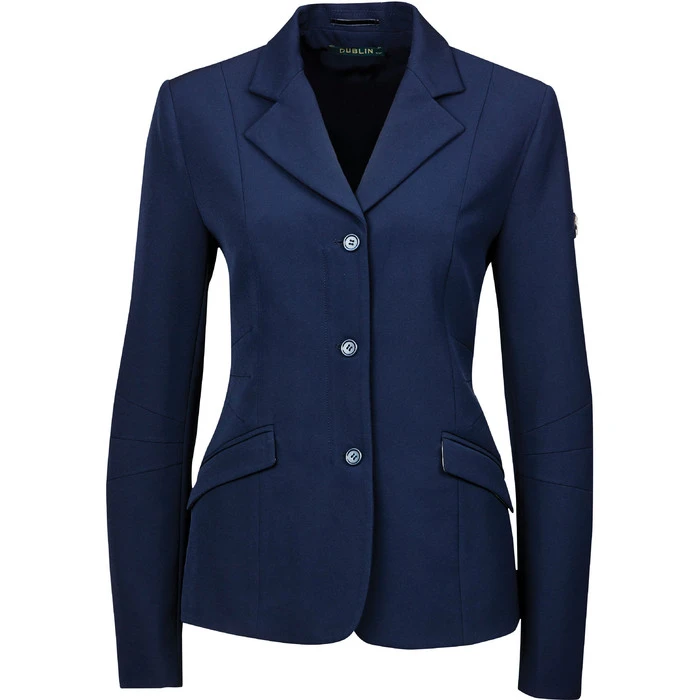 Tailored competition softshell jacket that is water repellant and breathable. Stretch fabric allows easy freedom of movement for comfort. Fully lined. Machine washable for easy maintenance. Stylish button detail on front & cuffs. Hidden centre zip closure. Hanger and garment bag included. 96% Polyester / 4% Spandex.